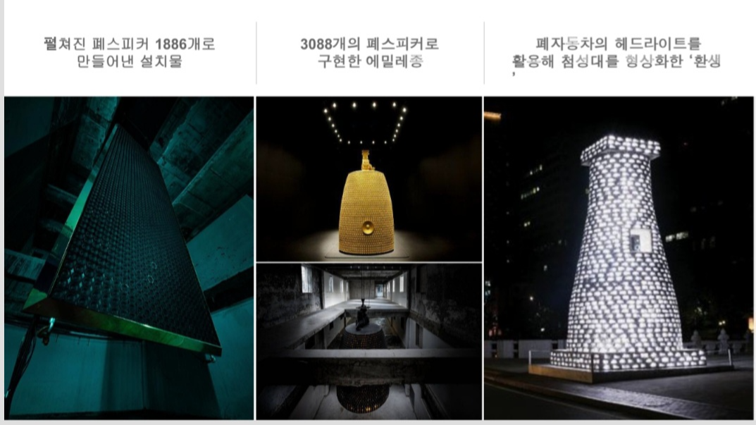 또한, 2006년에는 자동차 폐헤드라이트 1374개를 사용하여 첨성대를 재현한 '<환생>'과 2008년에는 폐스피커 3088개로 에밀레종으로 알려진 선덕대왕신종을 재현한 '<형연>'과 같은 대형 설치작품을 선보였습니다.