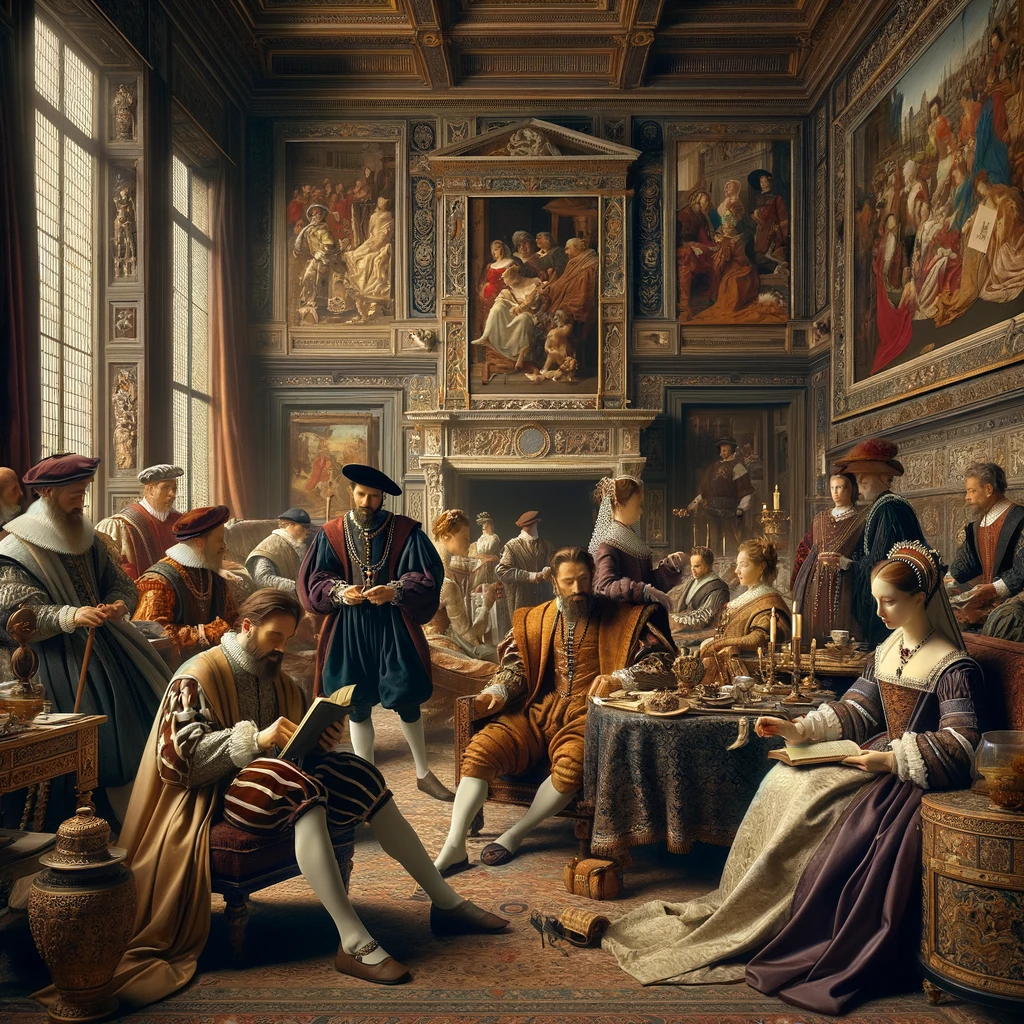 르네상스 시대의 피렌체에서 메리치 가문이 예술과 문화의 후원자로서 활동하는 모습을 역사적 재현으로 표현한 것입니다. 가문 구성원들이 시대에 맞는 복장을 하고 있으며, 르네상스 예술과 가구로 장식된 호화로운 방에서 독서, 토론, 예술 감상 등 다양한 활동을 하고 있는 모습을 볼 수 있습니다. 이러한 설정은 당시 메리치 가문의 부와 문화적 영향력을 반영하고 있습니다.