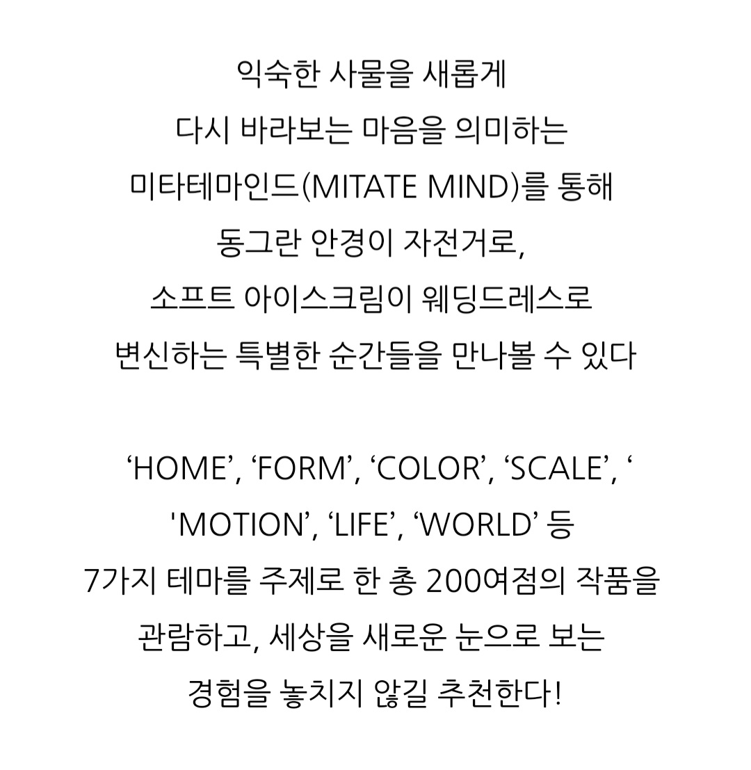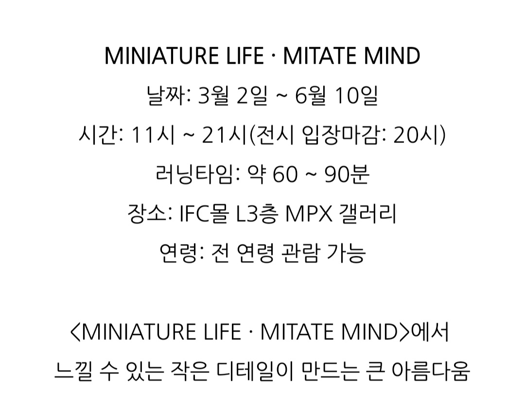 남녀노소 모두 즐겁게 관람하며서 미니어터 작품에서 펼치는 상상의 세계를 느껴보세요.^^ 익숙한 사물을 새롭게 바로보는 즐거운 전시가 될 것입니다.