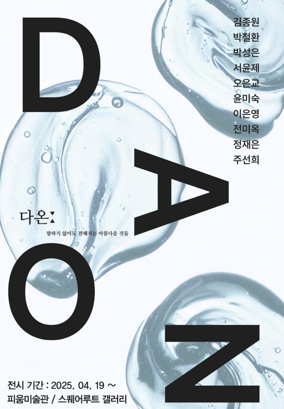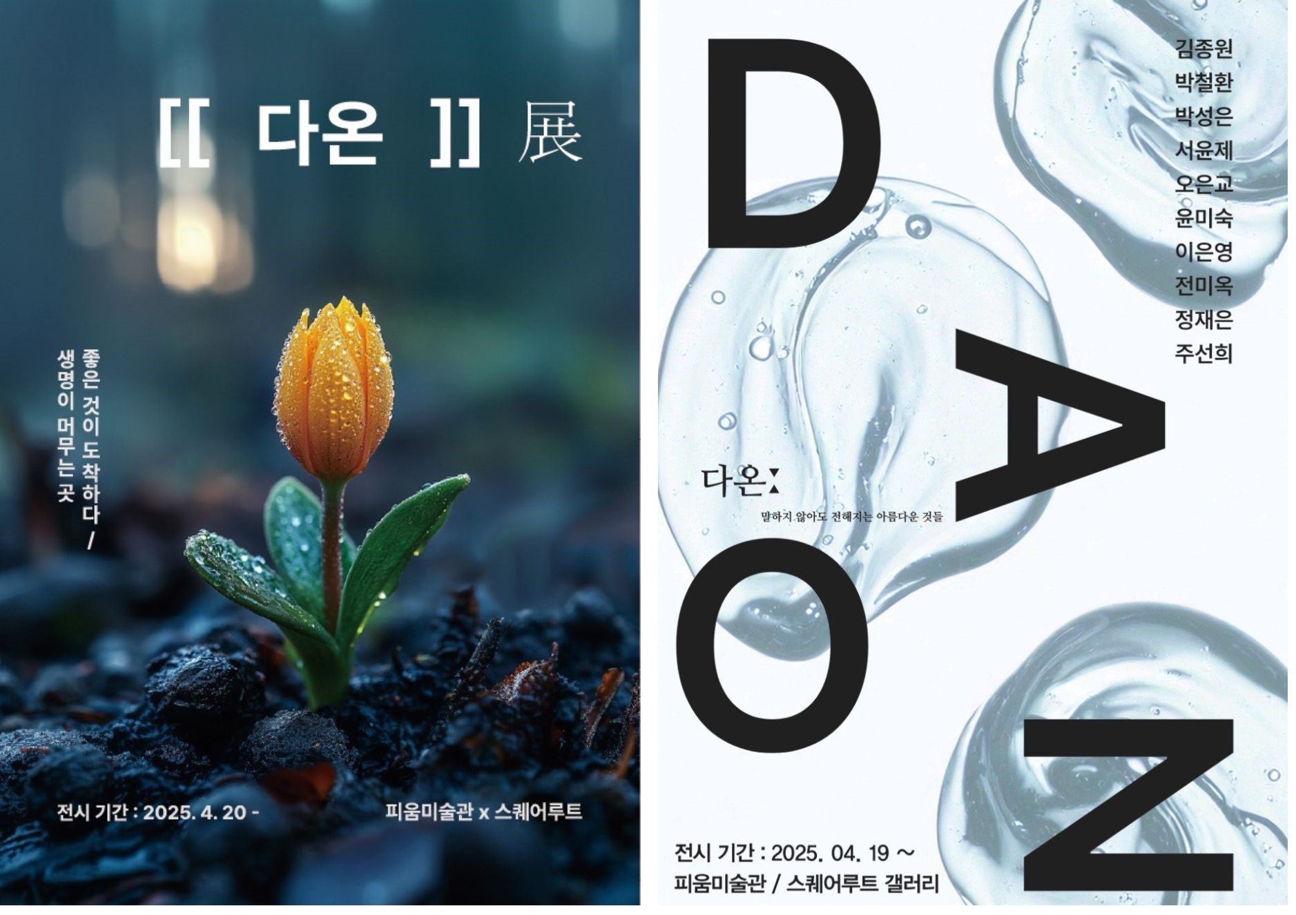 2025년 4월 19일부터 피움미술관과 스퀘어루트 갤러리에서 열리는 <다온 DAON> 전시는 ‘좋은 일들이 다 오는’이라는 뜻을 담은 감성예술 전시입니다. ‘말하지 않아도 전해지는 아름다운 것들’을 주제로, 자연, 감정, 기억, 존재를 조형적으로 해석한 작품들이 관람객을 맞이합니다.